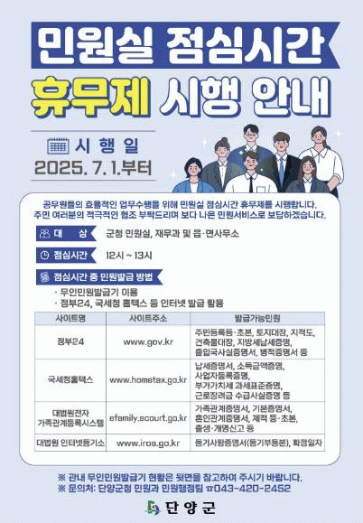 Á¡½É½Ã°£(12:00¡13:00) µ¿¾È¿¡´Â ¹Î¿øÃ¢±¸ ¿î¿µÀÌ ÀϽà ÁߴܵǸç, ÀÌ ½Ã°£¿¡´Â ¹«Àιοø¹ß±Þ±â¿Í Á¤ºÎ24, ±¹¼¼Ã» ȨÅýº µî ¿Â¶óÀÎ ¼ºñ½º¸¦ ÅëÇØ °¢Á¾ ¹Î¿ø¼·ù ¹ß±ÞÀÌ °¡´ÉÇÏ´Ù.