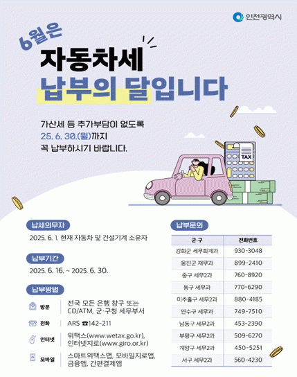 ÀÚµ¿Â÷¼¼´Â ¸Å³â 6¿ù°ú 12¿ù µÎ Â÷·Ê ºÎ°úµÇ¸ç, À̹ø 6¿ùºÐ ÀÚµ¿Â÷¼¼´Â 6¿ù 1ÀÏ ±âÁØÀ¸·Î ÀÎõ½Ã¿¡ µî·ÏµÈ ÀÚµ¿Â÷ ¹× °Ç¼³±â°è(´ýÇÁÆ®·°, ÄÜÅ©¸®Æ®¹Í¼Æ®·° µî)ÀÇ ¼ÒÀ¯ÀÚ¿¡°Ô ºÎ°úµÈ´Ù.