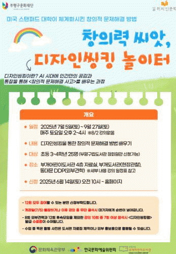 ÃʵîÇб³ 3¡¤4Çгâ ÇлýÀÌ ´ë»óÀÎ À̹ø ÇÁ·Î±×·¥Àº ¹Ì±¹ ½ºÅÄÆÛµå´ëÇб³¿¡¼ ü°èÈÇÑ Ã¢ÀÇÀû ¹®Á¦ÇØ°á ¹æ¹ýÀÎ ¡®µðÀÚÀξÅÅ·(Design Thinking)¡¯À» ÁÖÁ¦·Î ¿À´Â 7¿ùºÎÅÍ 9¿ù±îÁö ÃÑ 12ȸ ¿î¿µµÈ´Ù.