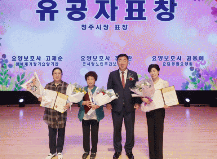 À̹ü¼® ûÁÖ½ÃÀåÀº Çà»ç¿¡ Âü¼®ÇØ ÅõöÇÑ ºÀ»çÁ¤½Å°ú Àå±â¿ä¾çº¸ÇèÀÇ ¹ßÀüÀ» À§ÇØ Èû¾²´Â Á¾»çÀڵ鿡°Ô ǥâÀ» ¼ö¿©Çϰí, ³ë°í¿¡ °¨»çÀÇ ¶æÀ» ÀüÇß´Ù.