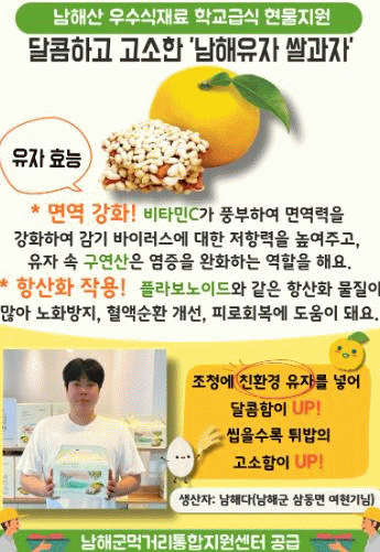 ±âºÎ ¹°Ç°ÀÎ ¡®³²ÇØÀ¯ÀÚ ½Ò°úÀÚ¡¯´Â ¾ÆÀ̵éÀÌ ¾È½ÉÇÏ°í ¸ÔÀ» ¼ö ÀÖµµ·Ï ¸¸µç Á¦Ç°À¸·Î, ³²ÇØÀÇ Çâ°ú ¸ÀÀ» ´ãÀº °Ç°ÇÑ °£½ÄÀÌ´Ù.