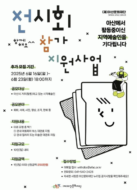 ÀÚ¼¼ÇÑ »ç¾÷³»¿ëÀº ¾Æ»ê¹®ÈÀç´Ü ȨÆäÀÌÁö ¾Ë¸²¸¶´çÀÇ °øÁö»çÇ׿¡¼ È®ÀÎÇÒ ¼ö ÀÖÀ¸¸ç, Áö¿ø½Åû¼´Â À̸ÞÀÏ·Î Á¦ÃâÇÏ¸é µÈ´Ù. ½ÅûÁ¢¼ö´Â 6¿ù 16ÀϺÎÅÍ 6¿ù 23ÀÏ 18:00±îÁöÀ̸ç, ¼±Á¤ °á°ú´Â ½É»ç ÈÄ (Àç)¾Æ»ê¹®ÈÀç´Ü ȨÆäÀÌÁö¿¡ º°µµ °øÁöÇÒ ¿¹Á¤ÀÌ´Ù.