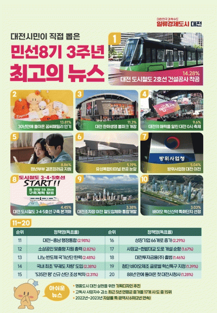 ÀÌ ¹Û¿¡µµ ¡ã°áÈ¥ÇÏ°í ½ÍÀº µµ½Ã ´ëÀü, û³â ºÎºÎ °áÈ¥Àå·Á±Ý Áö¿ø(5À§) ¡ã»õ·Î¿î ´ëÁß±³Åë ȯ½Â °ÅÁ¡, 15³â ½Ã¹Î ¼÷¿ø À¯¼ºº¹ÇÕÅ͹̳Π´«¾Õ(6À§) ¡ãK-¹æ»ê¼öµµ ´ëÀü ½Ã´ë °³¸·, ¹æÀ§»ç¾÷û ´ëÀü ÀÌÀü(7À§) ¡ã´ëÀü µµ½Ãöµµ¸ÁÀ» ´õ¿í ÃÎÃÎÇϰÔ, 3?4?5È£¼± ±¸Ãà º»°ÝÈ(8À§) ¡ã´ëÀüÁ¶Â÷Àå ÀÌÀü öµµÀÔÃ¼È ÅëÇÕ°³¹ß, ±¹°¡¼±µµ»ç¾÷ ¼±Á¤(9À§) ¡ã¼¼°èÀûÀÎ ¹ÙÀÌ¿À Çãºê µµ¾à ¹ßÆÇ, ¹ÙÀÌ¿À ƯȴÜÁö ¼±Á¤(10À§) µîÀÌ ½Ã¹Îµé·ÎºÎÅÍ ³ôÀº °ü½ÉÀ» ¹Þ¾Ò´Ù.