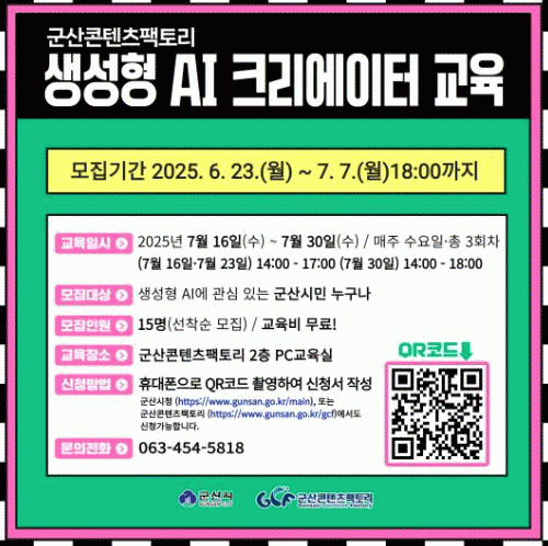 Âü¿© ½ÅûÀº 6¿ù 23ÀÏ¿¡¼ 7¿ù 7ÀϱîÁö ±º»ê½Ãû ¶Ç´Â ±º»êÄÜÅÙÃ÷ÆÑÅ丮´©¸®ÁýÀ» ÅëÇØ QR ºÎÈ£(ÄÚµå)·Î Á¢¼öÇÒ ¼ö ÀÖ´Ù. ±³À° Âü°¡ ÀοøÀº 15¸íÀ¸·Î ¼±Âø¼ø ¸ðÁý ¿¹Á¤ÀÌ´Ù.