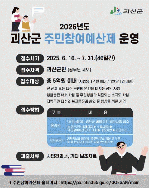 ±ºÀº ÁÖ¹ÎÂü¿©¿¹»ê »ç¾÷ ¹ß±¼À» À§ÇØ ¿À´Â 7¿ù 31ÀϱîÁö ±«»ê±º¹ÎÀ» ´ë»óÀ¸·Î ¼³¹®Á¶»ç¿Í »ç¾÷°ÇÀǼ¸¦ Á¢¼öÇÑ´Ù.