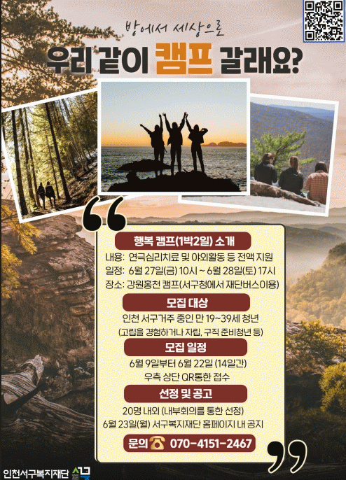 À̹ø Ä·ÇÁ´Â °¿øµµ ȫõ ÀÏ´ë¿¡¼ ÁøÇàµÇ¸ç, ¿¬±Ø ½É¸®Ä¡·á µî °¨Á¤ ȸº¹ ¹× °ü°è ȸº¹ ÇÁ·Î±×·¥À¸·Î ±¸¼ºµÈ´Ù.