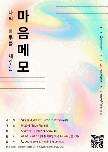 º» ÇÁ·Î±×·¥Àº ¡®2025³â ¹®ÇлóÁÖÀÛ°¡ Áö¿ø»ç¾÷(¹®ÈüÀ°°ü±¤ºÎ ÁÖÃÖ, Çѱ¹¹®È¿¹¼úÀ§¿øÈ¸ ÁÖ°ü, ±¹¹ÎüÀ°ÁøÈï°ø´Ü ÈÄ¿ø)¡¯ÀÇ ÀÏȯÀ¸·Î, ¡®»ç¶û, ±â»Ý, ºÐ³ë, ³î¶÷, ½½ÇÄ, µÎ·Á¿ò¡¯ µî ±âº» °¨Á¤ÀÇ ¹®ÇÐÀû Ž»ö°ú ±Û¾²±â¸¦ ÁÖ ³»¿ëÀ¸·Î ÇÑ´Ù.