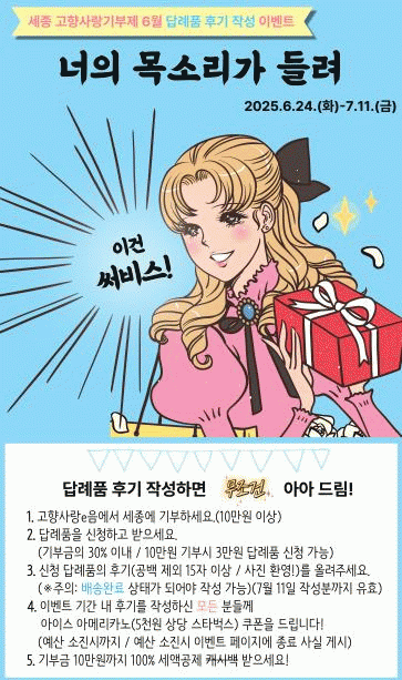 À̹ø Çà»ç´Â ¼¼Á¾ °íÇâ»ç¶û±âºÎÁ¦¿¡ 10¸¸ ¿ø ÀÌ»ó ±âºÎÇÏ°í ´ä·ÊǰÀ» ½Åû¡¤¼ö·ÉÇÑ µÚ Èı⸦ ÀÛ¼ºÇÑ ±âºÎÀÚ¶ó¸é ´©±¸³ª Âü¿©ÇÒ ¼ö ÀÖ´Ù.