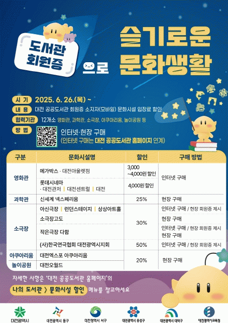 ÀÌ¿ë ¹æ¹ýÀº ¡®´ëÀü °ø°øµµ¼°ü¡¯ ȨÆäÀÌÁö ³» ¡®¹®È½Ã¼³ ÇÒÀΡ¯ ¸Þ´º¸¦ ÅëÇØ È®ÀÎÇÒ ¼ö ÀÖÀ¸¸ç, °ø°øµµ¼°ü ȸ¿øÁõ(¸ð¹ÙÀÏ Æ÷ÇÔ)À» Á¦½ÃÇϰųª ÀÎÁõ ÀýÂ÷¸¦ °ÅÃÄ ¿Â¶óÀÎ ¿¹¸Å ¶Ç´Â ÇöÀå ÀÔÀå ½Ã ÇÒÀÎÀ» ¹ÞÀ» ¼ö ÀÖ´Ù.