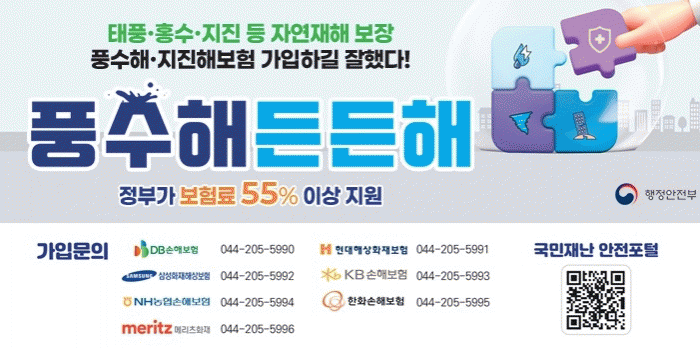 dz¼öÇØ¡¤ÁöÁøÀçÇØº¸ÇèÀº ÅÂdz, È«¼ö, ÁöÁø µî °¢Á¾ ÀÚ¿¬ÀçÇØ·Î ÀÎÇÑ Àç»ê ÇÇÇØ¸¦ º¸ÀåÇÏ´Â Á¤Ã¥º¸ÇèÀ¸·Î, Á¤ºÎ¿Í Á¤À¾½Ã°¡ º¸Çè·áÀÇ 55% ÀÌ»óÀ» Áö¿øÇÑ´Ù.