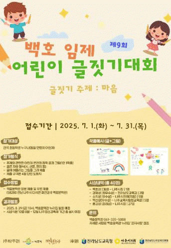 ¹éÈ£ÀÓÁ¦ ¾î¸°ÀÌ ±ÛÁþ±â´ëȸ´Â ³ªÁÖ Ãâ½Å Á¶¼± Á߱⠴ëÇ¥ ¹®ÀÎ ¹éÈ£ ÀÓÁ¦ ÀÇ ¹®ÇÐ Á¤½ÅÀ» ±â¸®°í ¾î¸°À̵éÀÇ °¨¼ö¼º°ú Ç¥Çö·ÂÀ» Ű¿ì±â À§ÇØ ³ªÁֽà ¹éÈ£¹®ÇаüÀÌ ÁÖ°üÇØ ¸Å³â ¿¸®°í ÀÖ´Ù.