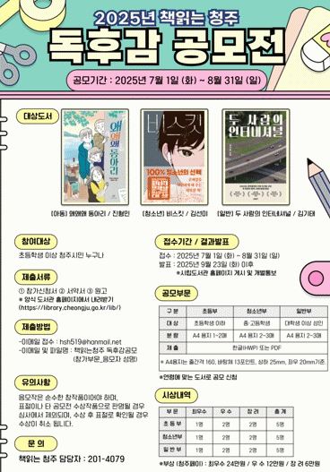 Á¦ÃâÀº µ¶Èݨ°ú ½Åû¼ µîÀ» ÀÛ¼ºÇØ Ã¥ÀдÂûÁÖ ´ã´çÀÚ À̸ÞÀÏ·Î Á¦ÃâÇÏ¸é µÈ´Ù. °ø¸ð ±â°£Àº ¿À´Â 7¿ù 1ÀϺÎÅÍ 8¿ù 31ÀϱîÁö´Ù.