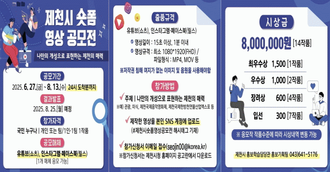 ÀÛǰÀº 15ÃÊ ÀÌ»ó 1ºÐ À̳»ÀÇ ¿µ»óÀ¸·Î Á¦ÀÛÇØ, ÇØ½ÃÅÂ±× #Á¦Ãµ½Ã¼ôÆû¿µ»ó°ø¸ðÀü°ú ÇÔ²² º»ÀÎ SNS °èÁ¤¿¡ ¾÷·ÎµåÇÑ ÈÄ, Âü°¡½Åû¼¸¦ À̸ÞÀÏ·Î Á¦ÃâÇÏ¸é µÈ´Ù.