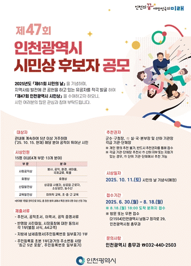 Èĺ¸ÀÚ´Â 2025³â 10¿ù 15ÀÏ ±âÁØÀ¸·Î ÀÎõ½Ã °ü³»¿¡ 5³â ÀÌ»ó °è¼Ó °ÅÁÖÇÑ ½Ã¹Î Áß ÇØ´ç ºÐ¾ß¿¡¼ ¶Ù¾î³ °øÀûÀÌ ÀÖ´Â »ç¶÷À̾î¾ß Çϸç, Ãßõ±ÇÀÚÀÇ ÃßõÀ» ÅëÇØ Á¢¼öÇÒ ¼ö ÀÖ´Ù.