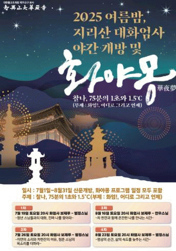 ü¤å¨ÙÓ(Ⱦ߸ù) ¼¼ºÎ ÀÏÁ¤ ÇÁ·Î±×·¥Àº ¡â¿©¸§¹ã Áö¸®»ê Ⱦö»ç °æ³»¿¡¼ ´©¾î¼ º° ºû º¸±â ¡âÁö¸®»ê »ê»çÀÇ °í¿äÇÔ ´À³¢±â(¹¬¾ð Èú¸µÀÇ ½Ã°£) ¡âÂ÷´ã, ¼Ò¿ø ¾²±â, ¼Ò¿ø ºô±â ¡âȾö»ç ¿ª»ç ¾ß°£ °æ³» Åõ¾î ¡â°³ÀÎ °¡Á·ÀÇ ¼Ò¿ø Ãà¿ø µîÀ¸·Î ÇÁ·Î±×·¥ÀÌ ÁøÇà µÈ´Ù.
