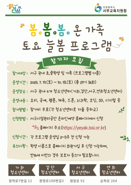 À̹ø ÇÁ·Î±×·¥Àº ÀÎõ¼±¸½Ã¼³°ü¸®°ø´Ü°úÀÇ ¾÷¹«Çù¾àÀ» ¹ÙÅÁÀ¸·Î ÃßÁøµÇ¸ç, °ü³» °¡Á¡¤¼±¸¡¤°Ë´Ü¡¤¿¬Èñ û¼Ò³â¼¾ÅÍ 4°÷¿¡¼ 7¿ù 19ÀϺÎÅÍ 10¿ù 18ÀϱîÁö ¸ÅÁÖ Åä¿äÀÏ ÃÑ 36ȸ¿¡ °ÉÃÄ ÁøÇàµÈ´Ù.