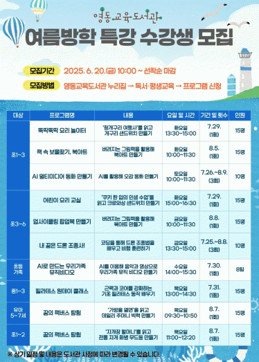 ¿©¸§¹æÇРƯ°Àº 7¿ù 25ÀϺÎÅÍ 8¿ù 9ÀϱîÁö ÁøÇàµÇ¸ç, ¼ö° ½ÅûÀº ¿µµ¿±³À°µµ¼°ü´©¸®ÁýÀ» ÅëÇØ ¼±Âø¼øÀ¸·Î ½ÅûÀÌ °¡´ÉÇÏ´Ù. ±âŸ ÀÚ¼¼ÇÑ »çÇ×Àº µµ¼°ü ´©¸®Áý °øÁö»çÇ×À» Âü°íÇϰųª ÀüÈ·Î ¹®ÀÇÇÏ¸é µÈ´Ù.