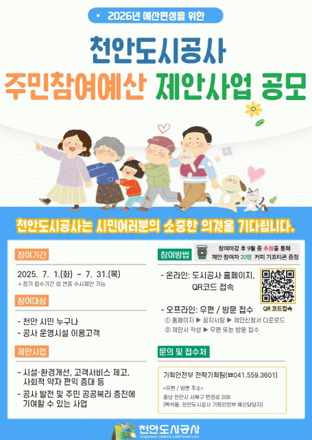 °ø¸ð¿¡´Â õ¾È½Ã¹Î ¶Ç´Â °ø»ç ½Ã¼³ ÀÌ¿ë°í°´ ´©±¸³ª Âü¿©ÇÒ ¼ö ÀÖÀ¸¸ç, Á¦¾È ºÐ¾ß´Â ¡ãµµ½Ã°ø»ç ½Ã¼³ ¹× ȯ°æ °³¼± ¡ãÁֹΠ¼ºñ½º Çâ»ó ¡ã»çȸÀû ¾àÀÚ ÆíÀÍ Áõ´ë µî °ø»çÀÇ ¹ßÀü°ú ½Ã¹Î º¹¸® ÁõÁø¿¡ ±â¿©ÇÒ ¼ö ÀÖ´Â ¸ðµç »ç¾÷ÀÌ´Ù.
