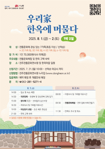 °¢ ȸÂ÷º°·Î 7°¡Á·±îÁö Âü¿©ÇÒ ¼ö ÀÖÀ¸¸ç, 1Àδç Âü°¡ºñ´Â 1¹Ú 2ÀÏ ¿¬¼ö´Â 7¸¸ ¿ø, 2¹Ú 3ÀÏ ¿¬¼ö´Â 10¸¸ ¿øÀÌ´Ù. ±âŸ ÀÚ¼¼ÇÑ »çÇ×Àº ÀüÁÖÀüÅ빮ȿ¬¼ö¿øÀ¸·Î ¹®ÀÇÇÏ¸é µÈ´Ù.