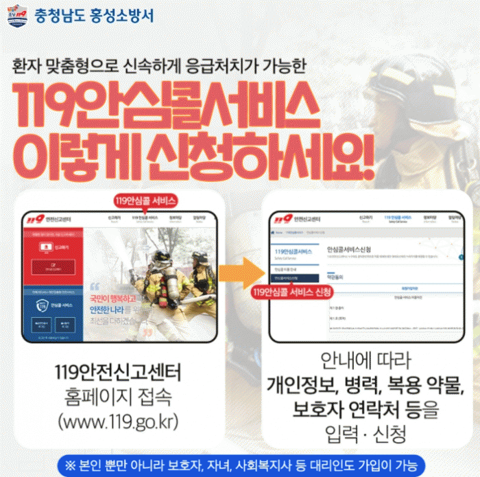 ¼ºñ½º °¡ÀÔÀº 119¾ÈÀü½Å°í¼¾ÅÍ È¨ÆäÀÌÁö¿¡ °³ÀÎÁ¤º¸, º´·Â, º¹¿ë ¾à¹°, º¸È£ÀÚ ¿¬¶ôó µîÀ» ÀÔ·ÂÇÑ ÈÄ ½ÅûÇÏ¸é µÈ´Ù. º»ÀλӸ¸ ¾Æ´Ï¶ó º¸È£ÀÚ, ÀÚ³à, »çȸº¹Áö»ç µî ´ë¸®Àεµ ´ë½Å °¡ÀÔÀÌ °¡´ÉÇÏ´Ù.