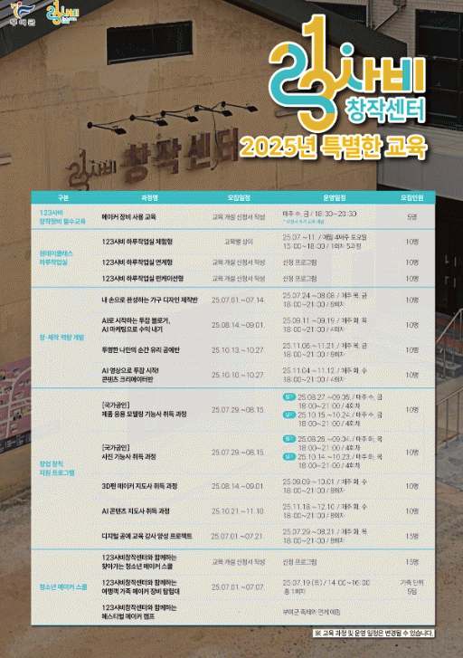 ¸ðµç ±³À°Àº ¹«·á·Î ÁøÇàµÇ¸ç, ½Åû Á¢¼ö¿Í ÇÁ·Î±×·¥ ÀÏÁ¤ µî ÀÚ¼¼ÇÑ ³»¿ëÀº ºÎ¿©±ºÃ» 123»çºñ°ø¿¹¸¶À» ´©¸®ÁýÀ» ÅëÇØ È®ÀÎÇÒ ¼ö ÀÖ´Ù.