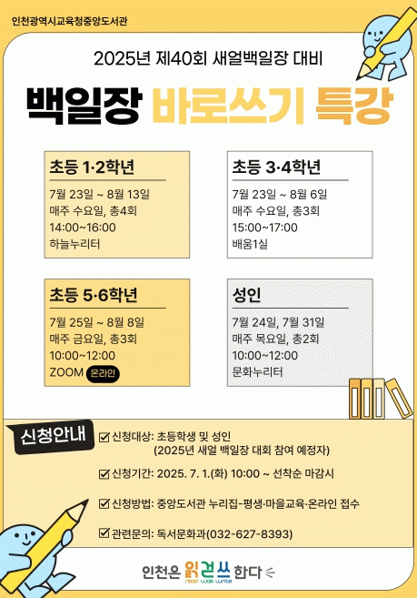 À̹ø Ư°Àº Ãʵî ÀúÇгâ(1~2Çгâ), ÁßÇгâ(3~4Çгâ), °íÇгâ(5~6Çгâ) ¹× ÀÏ¹Ý ¼ºÀÎÀ» ´ë»óÀ¸·Î ½Ã¿Í »ê¹® ¾²±âÀÇ ±âÃʺÎÅÍ ÇÕÆò ¹× Åð°í ¹æ¹ý±îÁö ´Ù·ç¸ç, âÀÇÀûÀÎ ±Û¾²±â ´É·Â Çâ»óÀ» ¸ñÇ¥·Î ÇÑ´Ù.