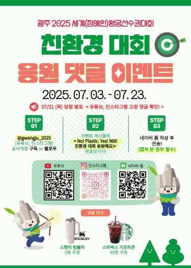 À̹ø À̺¥Æ®´Â ´ëȸ °ø½Ä »çȸ°ü°è¸Á °èÁ¤, À¯Æ©ºê ¹× ÀνºÅ¸±×·¥ À» ÅëÇØ ¡®Ä£È¯°æ ´ëȸ ÀÀ¿ø ´ñ±Û ´Þ±â¡¯·Î ÁøÇàµÈ´Ù. Âü¿© ¹æ¹ýÀº ´ëȸ °ø½Ä °èÁ¤À» ±¸µ¶(¶Ç´Â ÆÈ·Î¿ì)Çϰí, À̺¥Æ® °Ô½Ã¹°¿¡ ÀÀ¿ø ´ñ±ÛÀ» ÀÛ¼ºÇÑ ÈÄ ³×À̹ö Æû¿¡ Á¦ÃâÇÏ¸é µÈ´Ù. À̺¥Æ® Âü¿©ÀÚ Áß Ãß÷À» ÅëÇØ ÅÒºí·¯¿Í Ä¿ÇÇÄíÆùÀ» ÁõÁ¤ÇÑ´Ù.