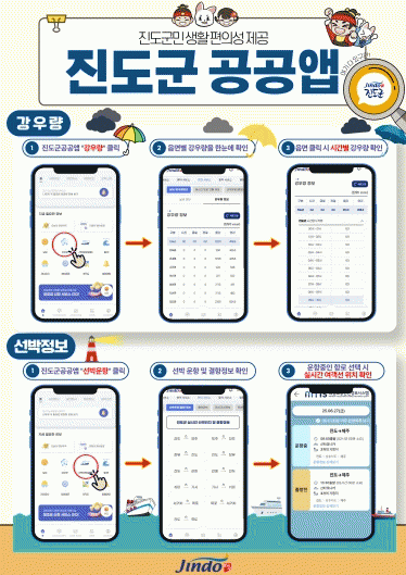 Áøµµ±º °ø°ø¾ÛÀº Áøµµ±º Àü¿ª°ú À¾¸éº° ½Ç½Ã°£ °¿ì·® Á¤º¸¸¦ ½Ã°¢ÈÇØ ½Ã°£º° ´©Àû·®, ÀüÀÏ, ±ÝÀÏ, ¿ù°£, ¿¬°£ °¿ì·®À» ½±°Ô È®ÀÎÇÒ ¼ö ÀÖµµ·Ï °³¼±ÇßÀ¸¸ç, Áøµµ±º °ü³»¿¡¼ ¿îÇ× ÁßÀÎ Ç×·ÎÀÇ ¿îÇ× ½Ã°£, ½Ç½Ã°£ ¼±¹Ú À§Ä¡, °áÇ× Á¤º¸±îÁö È®ÀÎÇÒ ¼ö ÀÖ´Ù.