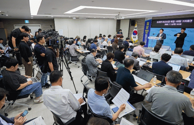 ¿À¼¼Çö ¾Æ»ê½ÃÀåÀÌ 3ÀÏ ÃëÀÓ 100ÀÏÀ» ¸Â¾Æ ½Ãû ºê¸®Çη뿡¼ ±âÀÚȸ°ßÀ» ¿°í ±×°£ÀÇ ½ÃÁ¤ ¼º°ú¿Í ÇâÈÄ ±¸»óÀ» ¹àÇû´Ù.