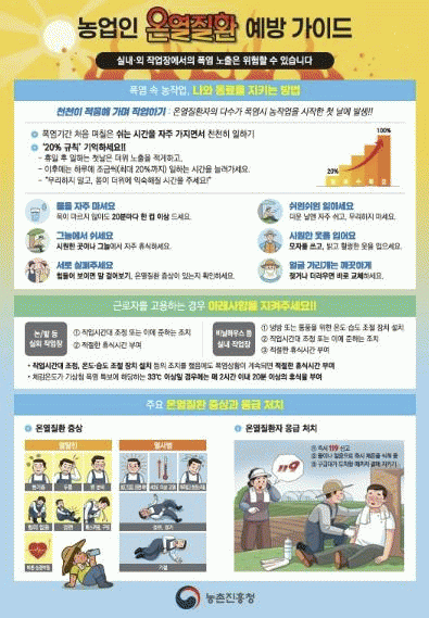 ÃÖ±Ù °í¿Â´Ù½ÀÇÑ ³¯¾¾°¡ ¿¬ÀÏ À̾îÁö¸é¼ ¾ß¿Ü ³óÀÛ¾÷¿¡ ³ª¼´Â ³ó¾÷ÀεéÀÇ °Ç°ÀÌ À§ÇèÇØ Áü¿¡ µû¶ó, ½Ã´Â ³óÀÛ¾÷¾ÈÀü°ü¸®ÀÚ¸¦ ÅëÇØ ½Ä¿°Æ÷µµ´ç, ³ØÄð·¯ µî ¿Â¿Áúȯ ¿¹¹æ¹°Ç°À» ÇöÀå¿¡ º¸±ÞÇÏ°í ¹«´õÀ§ ¼Ó ³óÀÛ¾÷ ¾ÈÀü¼öÄ¢À» Àû±Ø È«º¸ÇÏ¸ç ³ó¾÷ÀÎ ½º½º·Î °Ç°À» Áöų ¼ö ÀÖµµ·Ï µ½°í ÀÖ´Ù.