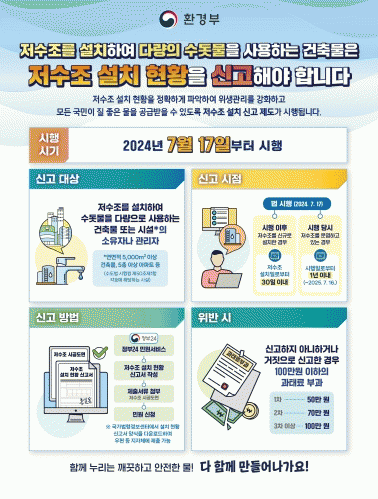 ¾ÈÀç¿Ï ¹°°ü¸®°úÀåÀº ¡°Àú¼öÁ¶ ¼³Ä¡ ÇöȲ ½Å°íÁ¦µµ´Â °ü³» Àú¼öÁ¶ ½Ã¼³ ÇöȲÀ» Á¤È®È÷ ÆÄ¾ÇÇØ ¼öµ¾¹° À§»ý °ü¸®ÀÇ Åõ¸í¼º°ú ½Å·Ú¼ºÀ» ³ôÀ̱â À§ÇÑ Áß¿äÇÑ Á¶Ä¡ÀÌ´Ù¡±¸ç ¡°½Å°í ´ë»óÀÌ µÇ´Â °ÇÃ๰ ¹× ½Ã¼³ ¼ÒÀ¯ÀÚ¿Í °ü¸®ÀÚ´Â °ü·Ã ÀýÂ÷¸¦ ÁؼöÇØ ±âÇÑ ³» ¹Ýµå½Ã ½Å°íÇØ ´Þ¶ó¡±°í ¸»Çß´Ù.