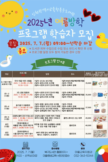 Âü¿© ½ÅûÀº 7¿ù 7ÀÏ ¿ÀÀü 9½ÃºÎÅÍ ºÏ±¸µµ¼°ü ´©¸®Áý¿¡¼ ¼±Âø¼ø ¸ðÁýÇϸç, ÀÚ¼¼ÇÑ »çÇ×Àº ºÏ±¸µµ¼°ü ´©¸®ÁýÀ» Âü°íÇϰųª, ¸¶À»±³À°Áö¿ø°ú·Î ¹®ÀÇÇÏ¸é µÈ´Ù.