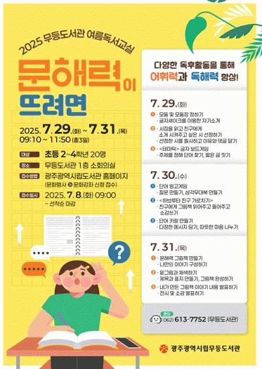 ¹«µîµµ¼°üÀº ÃʵîÇб³ 2~4Çгâ 20¸íÀ» ´ë»óÀ¸·Î µ¶Çط°ú ¾îÈÖ·ÂÀ» Ű¿ì´Â Ȱµ¿Çü ¼ö¾÷À» ¿î¿µÇÑ´Ù. ¡®¹®ÇØ·ÂÀÌ ¶ß·Á¸é¡¯À» ÁÖÁ¦·Î, ½Ã ÇÊ»ç, ±ÛÀÚ º¸µå°ÔÀÓ, ³ª¸¸ÀÇ ±×¸²Ã¥ ¸¸µé±â µîÀ» Ȱ¿ëÇÑ ¹®ÇØ·Â Çâ»ó ÇÁ·Î±×·¥À» ÁøÇàÇÑ´Ù.