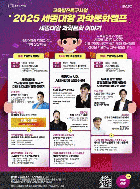 ¡®¼¼Á¾´ë¿ÕÀÇ ÁöÇý·Î ¿©´Â °úÇÐ »ó»óÀÇ ¹®¡¯À» ÁÖÁ¦·Î ¿¸®´Â À̹ø Ä·ÇÁ´Â Àα⠰úÇиí»ç °¿¬°ú üÇèȰµ¿, ½Å±â¼ú Ȱ¿ë ¹ß¸í±³À° µî °¢¾ç°¢»öÀÇ ÇÁ·Î±×·¥À¸·Î ±¸¼ºµÆ´Ù.