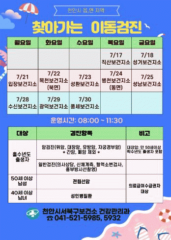 À̵¿°Ç°°ËÁø ÀÏÁ¤Àº ¡ã17ÀÏ, Á÷»êº¸°ÇÁö¼Ò ¡ã18ÀÏ, ¼º°Åº¸°ÇÁö¼Ò ¡ã21ÀÏ, ÀÔÀ庸°ÇÁö¼Ò ¡ã22ÀÏ, ¸ñõº¸°ÇÁö¼Ò ¡ã23ÀÏ, ¼ºÈ¯º¸°ÇÁö¼Ò ¡ã24ÀÏ, º´Ãµº¸°ÇÁö¼Ò ¡ã25ÀÏ, ¼º³²º¸°ÇÁö¼Ò ¡ã28ÀÏ, ¼ö½Åº¸°ÇÁö¼Ò ¡ã29ÀÏ, ±¤´öº¸°ÇÁö¼Ò ¡ã30ÀÏ, dz¼¼º¸°ÇÁö¼Ò ¼øÀ¸·Î ÁøÇàÇÑ´Ù.