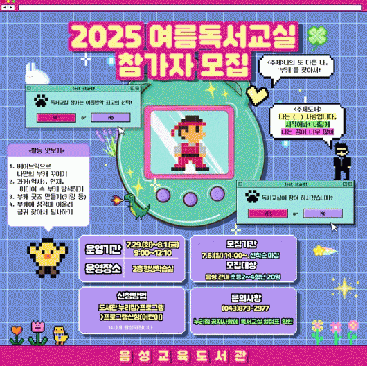 Âü°¡ ½ÅûÀº 7¿ù 6ÀϺÎÅÍ À½¼º±³À°µµ¼°ü ´©¸®ÁýÀÇ 'ÇÁ·Î±×·¥ ¡æ ÇÁ·Î±×·¥½Åû(¾î¸°ÀÌ)' ¸Þ´º¿¡¼ ¼±Âø¼ø Á¢¼ö·Î ÁøÇàµÇ¸ç, °ü³» ÃʵîÇлý ´©±¸³ª ½ÅûÇÒ ¼ö ÀÖ´Ù. ÀÚ¼¼ÇÑ »çÇ×Àº µµ¼°üÀ¸·Î ¹®ÀÇÇÏ¸é µÈ´Ù.