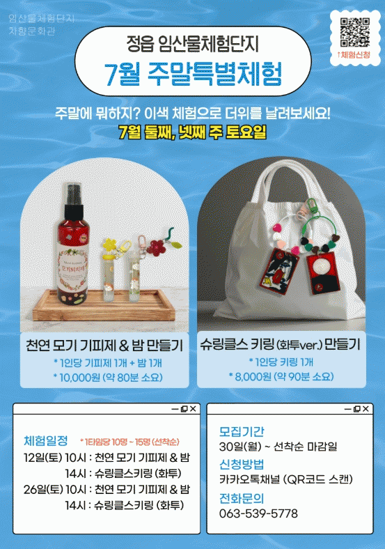 Â÷Ç⹮ȰüÀÇ Ã¼ÇèÀº ¼±Âø¼ø ¿¹¾àÁ¦·Î ¿î¿µµÈ´Ù. Âü¿©¸¦ ¿øÇÏ´Â ½Ã¹Î°ú °ü±¤°´Àº ÀüÈ(063-539-5778)³ª īī¿ÀÅå ä³Î(Á¤À¾Àӻ깰üÇè´ÜÁö)À» ÅëÇØ ¿¹¾àÇÒ ¼ö ÀÖ´Ù.