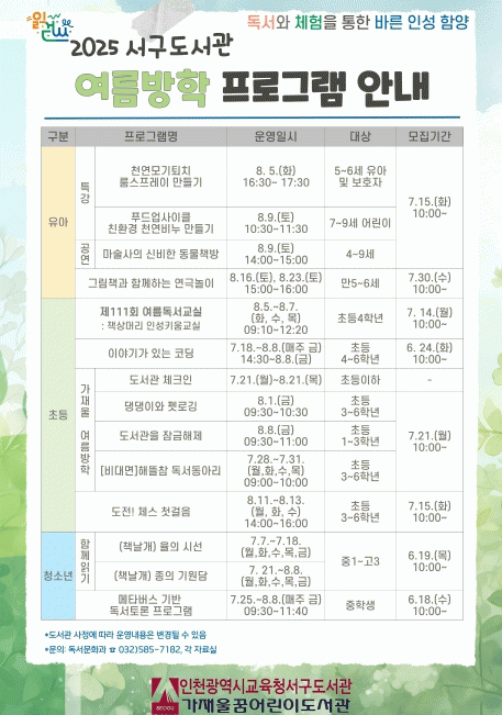 ¡®°¡Àç¿ï¿¡¼ ¿©¸§¹æÇгª±â¡¯´Â 7¿ù 21ÀϺÎÅÍ 8¿ù 14ÀϱîÁö ÃʵîÇлýÀ» ´ë»óÀ¸·Î ÁøÇàµÇ¸ç, Ã¥°ú Ä£ÇØÁö´Â Ȱµ¿°ú ÇÔ²² ¹Ý·Á°ß°ú ¾²·¹±â Áݱâ, ±×¸²Ã¥ Àб⸦ °áÇÕÇÑ ¡®´ó´óÀÌ¿Í Æê·Î±ë¡¯ ÇÁ·Î±×·¥µµ ¸¶·ÃµÆ´Ù.