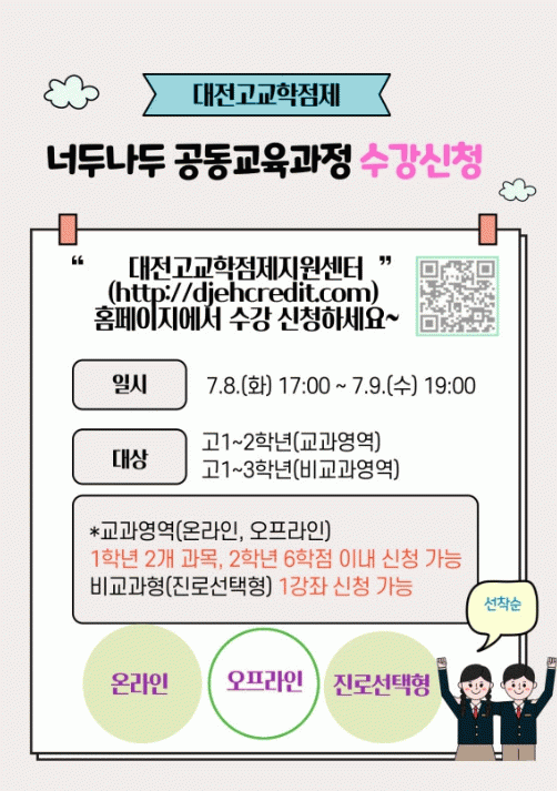 2Çб⠰øµ¿±³À°°úÁ¤Àº ÃÑ 339°³ °Á·Π¿Â¶óÀÎ 33°ÁÂ, ¿ÀÇÁ¶óÀÎ 212°ÁÂ, Áø·Î¼±ÅÃÇü 94°Á°¡ °³¼³µÉ ¿¹Á¤ÀÌ´Ù. ½Åû ´ë»óÀº ±³°ú ¿µ¿ªÀº °íµîÇб³ 1, 2Çгâ, ºñ±³°ú ¿µ¿ªÀº ÀüÇгâ À̸ç, °Á »ó¼¼ ³»¿ëÀº ¡®´ëÀü°í±³ÇÐÁ¡Á¦Áö¿ø¼¾ÅÍ¡¯ ȨÆäÀÌÁö¿¡¼ È®ÀÎÇÒ ¼ö ÀÖ´Ù. ¼ö°½ÅûÀº 7¿ù 8ÀÏ 17:00ºÎÅÍ 7¿ù 9ÀÏ 19:00±îÁö ȨÆäÀÌÁö ³»¡®³ÊµÎ³ªµÎ °øµ¿±³À°°úÁ¤¡¯ÅÇ¿¡¼ ¿Â¶óÀÎÀ¸·Î ½Åû °¡´ÉÇÏ¸ç ¼±Âø¼ø ¸¶°¨µÈ´Ù.