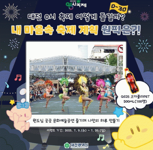 ´ëÀü½Ã´Â ¿À´Â 8¿ù 8ÀÏ °³¸·ÇÏ´Â ¡®2025 ´ëÀü 0½Ã ÃàÁ¦¡¯¸¦ ¾ÕµÎ°í, ÃàÁ¦¸¦ È«º¸ÇÏ°í ½Ã¹ÎµéÀÇ Âü¿©¸¦ À¯µµÇϱâ À§ÇÑ ¡®D-30 ±â³ä SNS À̺¥Æ®¡¯¸¦ ÁøÇàÇÑ´Ù. À̺¥Æ® Âü¿©´Â 7¿ù 20ÀϱîÁö °¡´ÉÇϸç, Ãß÷À» ÅëÇØ ÃÑ 100¸í¿¡°Ô ÆíÀÇÁ¡ ±âÇÁƼÄÜÀÌ Á¦°øµÈ´Ù.