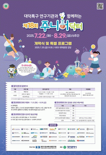 ´ëÀü½Ã°¡ ÁÖÃÖÇϰí Çѱ¹±âÃʰúÇÐÁö¿ø¿¬±¸¿øÀÌ ÁÖ°üÇÏ´Â ¡®ÁִϾî´ÚÅÍ ÇÁ·Î±×·¥¡¯Àº û¼Ò³âµéÀÌ ´ë´ö¿¬±¸°³¹ßƯ±¸ ³» Ã⿬¿¬, ´ëÇÐ, °ø°ø±â°ü, ¹Î°£±â°ü µî ÃÑ 35°³ Âü¿©±â°ü¿¡¼ °úÇбâ¼ú ÀÎÇÁ¶ó¸¦ üÇèÇÏ¸ç °úÇÐÀÚÀÇ ²ÞÀ» Ű¿ï ¼ö ÀÖµµ·Ï Áö¿øÇÏ´Â ¿©¸§¹æÇÐ °úÇРüÇè ÇÁ·Î±×·¥ÀÌ´Ù.