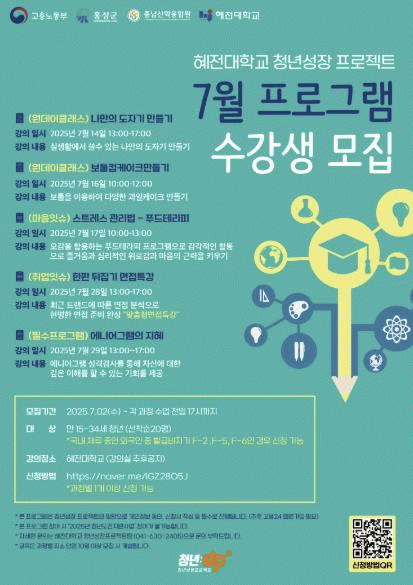 ¸ðÁý ´ë»óÀº ¸¸ 15¼¼ºÎÅÍ 34¼¼±îÁöÀÇ Ã»³âÀ̸ç, °¢ °úÁ¤´ç ¼±Âø¼ø 20¸íÀ» ¸ðÁýÇÑ´Ù. ¸ðÁý ±â°£Àº °¢ °úÁ¤ ¼ö¾÷ ÀüÀϱîÁöÀ̸ç, ½ÅûÀº ¿Â¶óÀÎÀ» ÅëÇØ °¡´ÉÇÏ´Ù. ÀÚ¼¼ÇÑ ¹®ÀÇ´Â ÇýÀü´ëÇб³ û³â¼ºÀå ÇÁ·ÎÁ§Æ®ÆÀÀ¸·Î ÇÏ¸é µÈ´Ù.