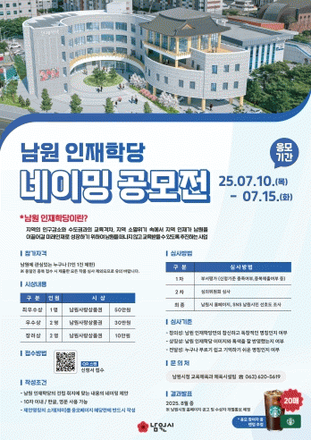 À̹ø °ø¸ðÀüÀº ³²¿ø ÀÎÀçÇÐ´ç °Ç¸³ ÃëÁö¿¡ ¸Â´Â ÀǹÌÀÖ°í Âü½ÅÇÑ »õ À̸§À» ã±â À§ÇÏ¿© ½Ç½ÃµÇ¸ç ³²¿ø¿¡ °ü½ÉÀÌ ÀÖ´Â ´©±¸³ª Âü¿©°¡ °¡´ÉÇÏ´Ù.