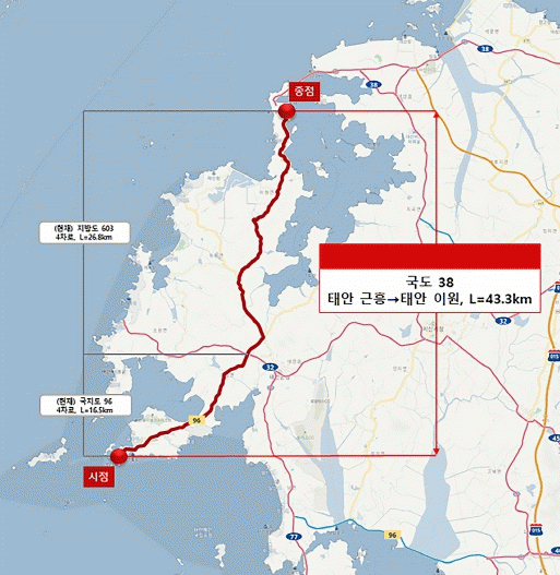 ±º¿¡ µû¸£¸é, ±¹Åä±³ÅëºÎ´Â 9ÀÏ ±¹Áöµµ96È£¿Í Áö¹æµµ603È£¼±ÀÇ ¡®±¹µµ38È£¡¯ ½Â°ÝÀ» ¹ßÇ¥Çß´Ù. ±¹µµ38È£¼±ÀÇ ½ÃÀÛÁ¡À» ±âÁ¸ žȱº ÀÌ¿ø¸é ³»¸®¿¡¼ ±ÙÈï¸é ½ÅÁøµµ¸®·Î º¯°æÇØ ÃÑ 43.3km¸¦ ±¹µµ·Î ÁöÁ¤ÇÏ´Â °ÍÀÌ °ñÀÚ´Ù.