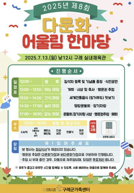 ÀÌ Çà»ç´Â ´Ù¹®È°¡Á· °£ ±³·ù È®´ë¿Í ¹®È ÀÌÇØ ÁõÁø, °Ç°ÇÑ ´Ù¹®È »çȸ Á¤ÂøÀ» ¸ñÇ¥·Î ¸Å³â ¿¸®°í ÀÖÀ¸¸ç, ´Ù¹®È°¡Á· °£ÀÇ ÈÇÕÀ» ÅëÇØ Áö¿ª»çȸ Âü¿©¸¦ ½ÇÇöÇÏ´Â ÀÇ¹Ì ÀÖ´Â Çà»ç´Ù.