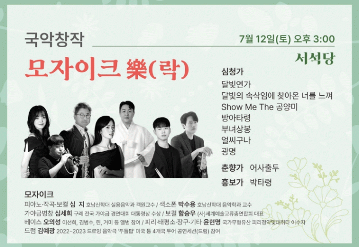 À̹ø ¹«´ë ¡®¸ðÀÚÀÌÅ© äÅ(¶ô)¡¯Àº ±¹¾Ç°ú ÀçÁî°¡ ¾î¿ì·¯Áö´Â Ç»Àü °ø¿¬À¸·Î, ¼·Î ´Ù¸¥ À½¾ÇÀû »ö並 Áö´Ñ ¾Ç±âµéÀÌ ÇϳªÀÇ ¼±À²·Î Á¶È¸¦ ÀÌ·ç¸ç, °ü°´¿¡°Ô »õ·Î¿î °¨µ¿À» ÀüÇÑ´Ù. ¶ÇÇÑ ¼¶¼¼ÇÑ ±¹¾Ç ¼±À²°ú ÀÚÀ¯·Î¿î ÀçÁî ÁïÈ↓ÁÖ°¡ ¾î¿ì·¯Á® ÀüÅë°ú Çö´ëÀÇ »õ·Î¿î °¨¼ºÀ» ¼±º¸À̸ç, Àå¾Ö ¿¹¼úÀΰú ºñÀå¾Ö ¿¹¼úÀÎÀÌ ÇÔ²² ¹«´ë¸¦ ²Ù¸ç ÈÇÕ°ú °øÁ¸ÀÇ ¸Þ½ÃÁö¸¦ Àü´ÞÇÒ ¿¹Á¤ÀÌ´Ù.
