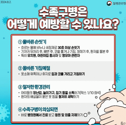 ¼öÁ·±¸º´ ¿¹¹æÀ» À§Çؼ´Â ¡ã¿ÜÃâ ÈÄ, ¹èº¯ ÈÄ, ½Ä»çÀü¡¤ÈÄ, ±âÀú±Í µÚó¸® ÈÄ¿¡ È帣´Â ¹°¿¡ ºñ´©·Î 30ÃÊ ÀÌ»ó ¼Õ ¾Ä±â ¡ã¹è¼³¹° ¹¯Àº ¿ÊÀº ±ú²ýÇÏ°Ô ¼¼Å¹Çϱ⠡ãÀå³°¨¡¤³îÀ̱ⱸ¡¤Áý±â·ù µî ÀÚÁÖ ¼Òµ¶Çϱ⠡å ÀÇ½É Áõ»ó ¹ß»ý ½Ã ÀÇ·á±â°üÀ» ¹æ¹®ÇØ Áø·á¹Þ°í µî¿ø ÀÚÁ¦Çϱ⠵îÀÇ ¼öÄ¢À» ÁöÄÑ¾ß ÇÑ´Ù.