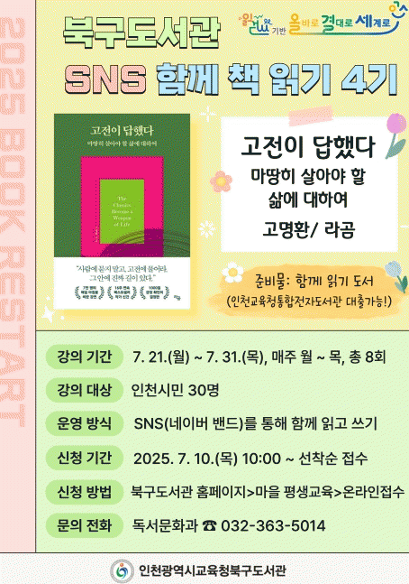 À̹ø ÇÁ·Î±×·¥Àº 7¿ù 21ÀϺÎÅÍ 31ÀϱîÁö 8ȸ¿¡ °ÉÃÄ ¿î¿µµÇ¸ç, °í¸íȯ ÀÛ°¡ÀÇ ¡®°íÀüÀÌ ´äÇß´Ù ¸¶¶¥È÷ »ì¾Æ¾ß ÇÒ »î¿¡ ´ëÇÏ¿©¡¯¸¦ ÇÔ²² Àд´Ù.