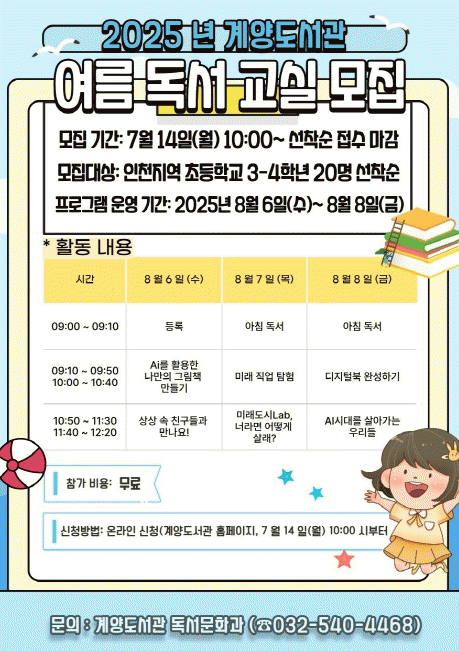 Âü°¡ ½ÅûÀº 7¿ù 14ÀϺÎÅÍ °è¾çµµ¼°ü ´©¸®Áý¿¡¼ ¼±Âø¼ø Á¢¼öÇϸç, ÀÚ¼¼ÇÑ »çÇ×Àº °è¾çµµ¼°ü ´©¸®ÁýÀ» Âü°íÇϰųª ¾î¸°ÀÌÀÚ·á½Ç·Î ¹®ÀÇÇÏ¸é µÈ´Ù.