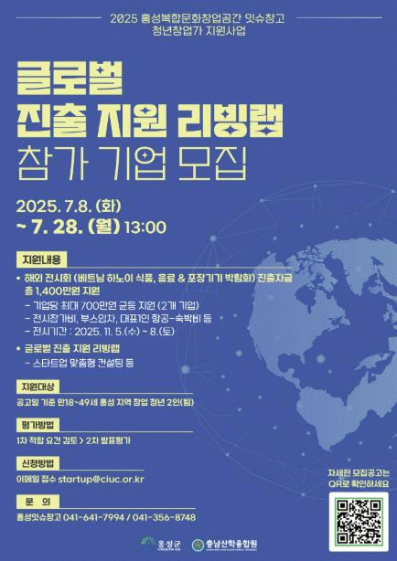 Áö¿ø´ë»ó ¼±Á¤ ±âÁØÀº °ø°íÀÏ ±âÁØ(2025. 7. 8.) È«¼º±º °ü³» 18¼¼ ÀÌ»ó~49¼¼ ÀÌÇÏ, ¾÷·Â 7³â ¹Ì¸¸(2018³â 7¿ù 9ÀÏ ÀÌÈÄ Ã¢¾÷ÇÑ »ç¶÷)ÀÇ Ã»³â ±â¾÷À̸ç, ½ÅûÀº 7. 28. 13:00±îÁö À̸ÞÀÏ·Î ÇÏ¸é µÈ´Ù.